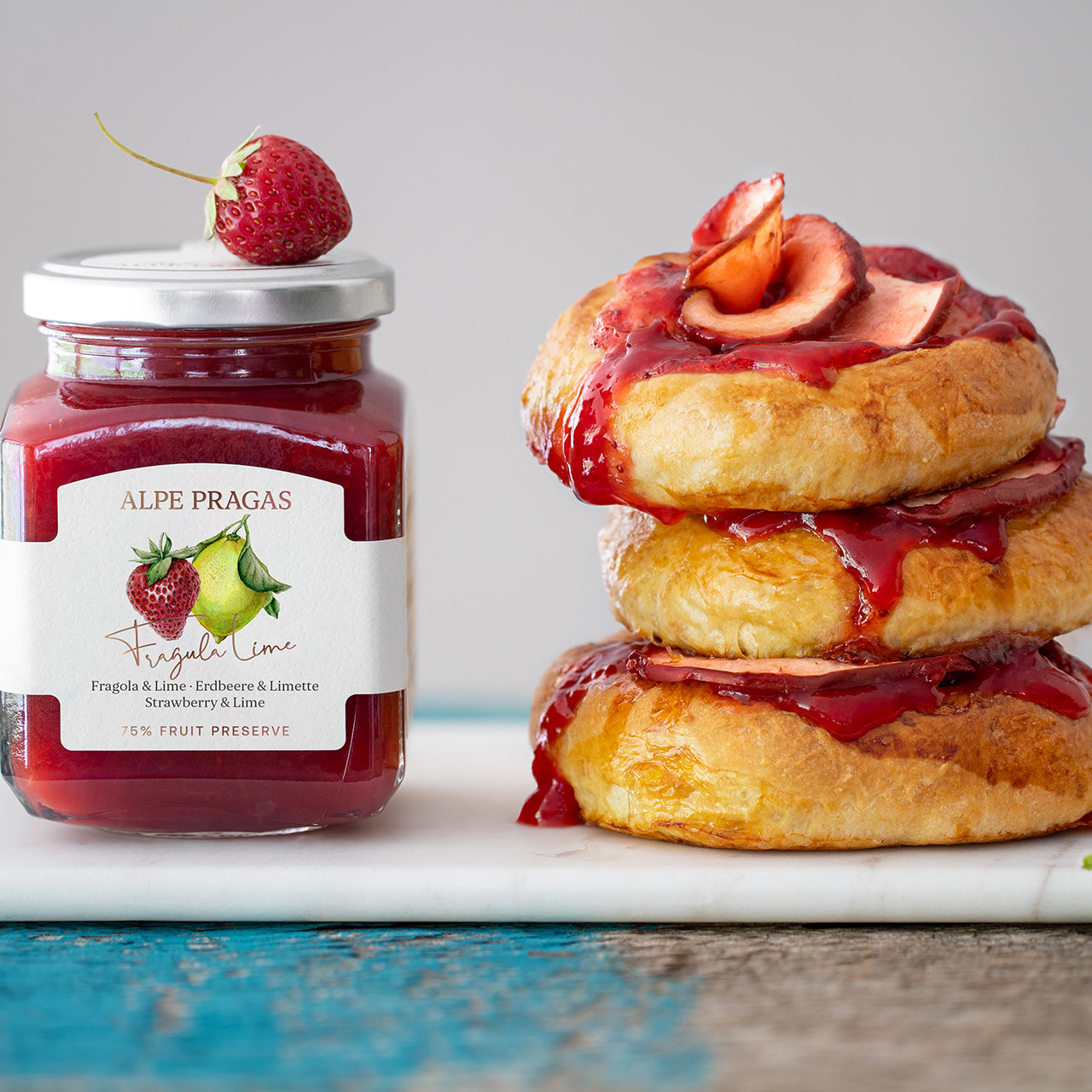 Fruchtaufstrich Erdbeere & Limette - Aromatische Erdbeeren gepaart mit erfrischender Limette. Die von Alpe Pragas angebaute und verwendete Sorte Senga Sengana ist mittelfrüh reifend mit mittelgroßen, dunkelroten und sehr aromatischen Früchten. In Kombination mit der Limette ein herrlich erfrischender Aufstrich auf das Frühstücksbrot.