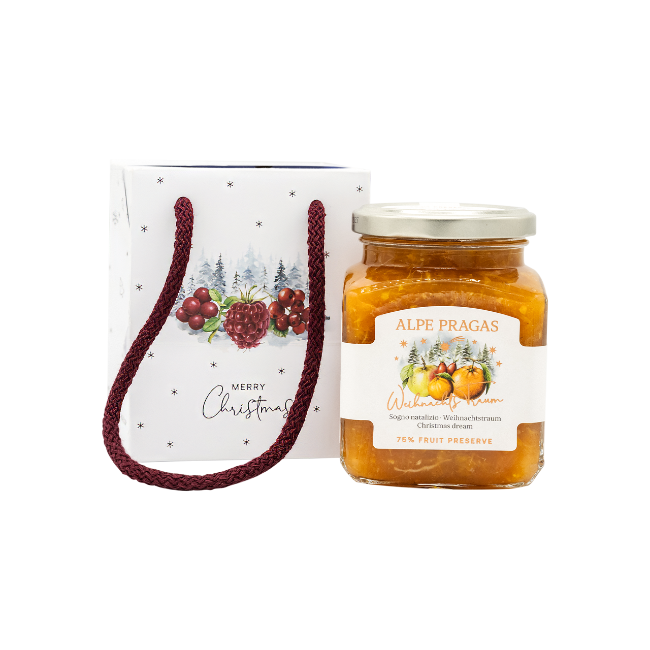 Questa confezione regalo per Natale con una composta di frutta al gusto Sogno Natalizio è un pensiero gustoso.