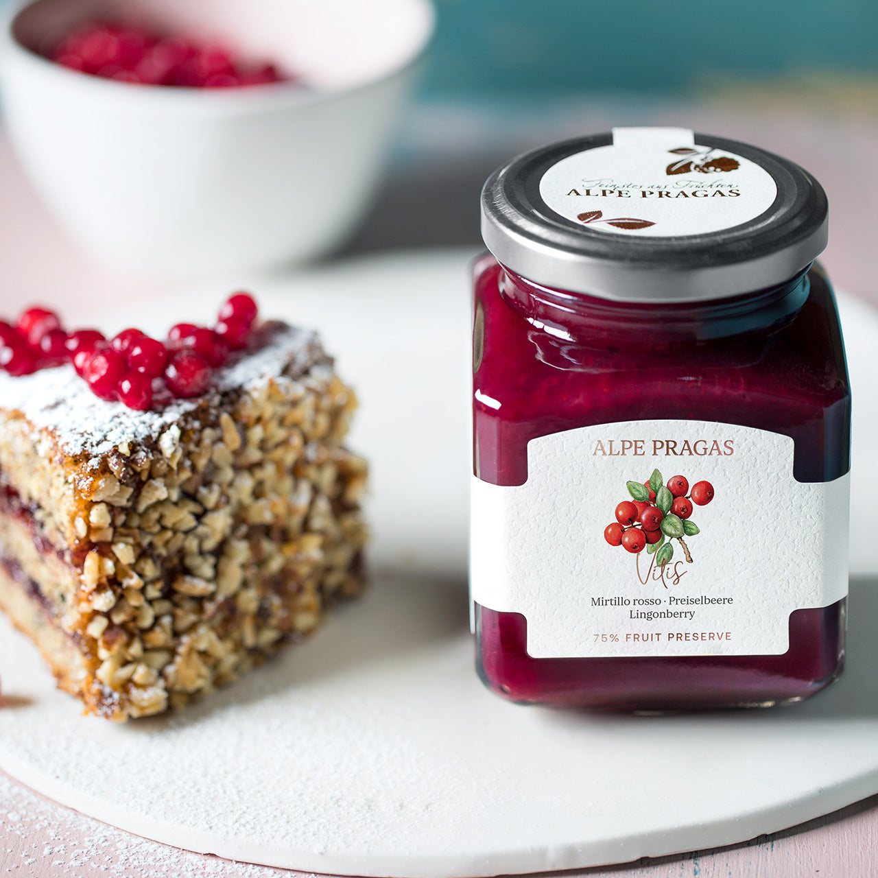 Ingredienti - mirtilli rossi* (75%), zucchero, succo di limone, gelificante: pectine (da mela) - (*da raccolta selvatica)