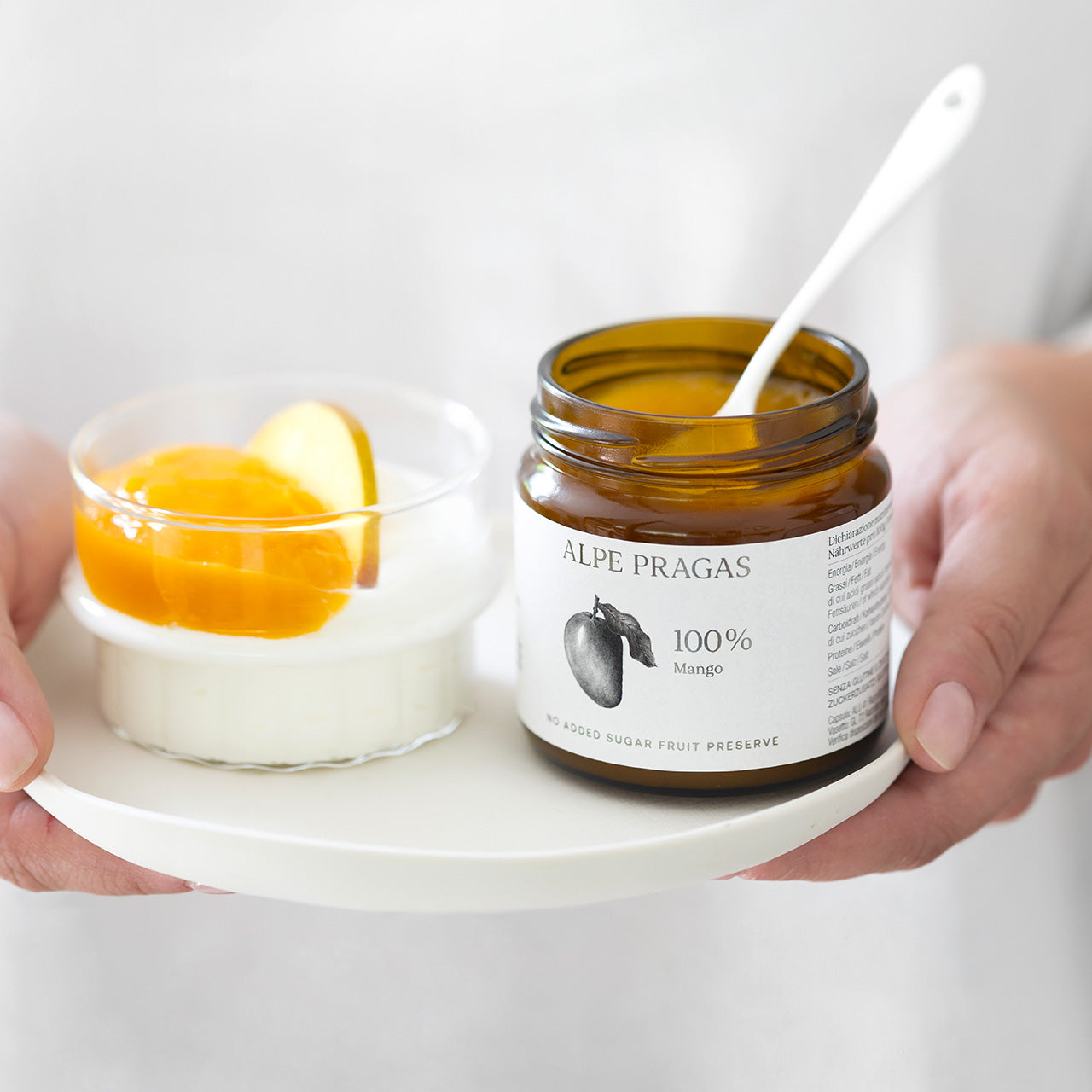 Composta di Mango. Delizia di frutta, senza zuccheri aggiunti e priva di additivi artificiali. La frutta é lavorata con la massima cura e ne preserviamo la freschezza attraverso una delicata pastorizzazione.