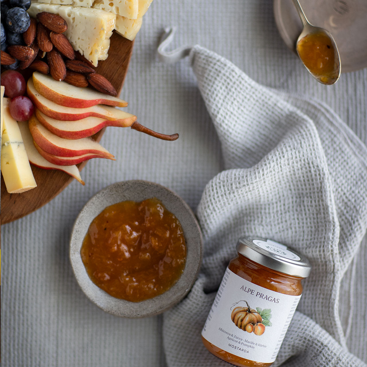 Mostarda Albicocca & Zucca - Creazione fruttata di albicocca e zucca, aromatizzata con anice stellato. Ottimo con formaggi grassi, semi grassi e formaggi di montagna di media stagionatura.